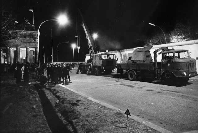 Ost-Berlin: Vorbereitungen für die Öffnung des Brandenburger Tors, das erste Mauersegment wird entfernt. © Gerd Gäbler